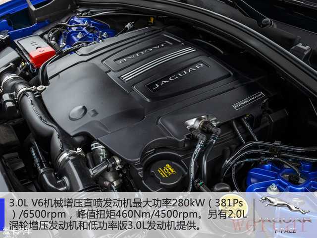 抛开为欧洲用户提供的柴油版车型不提,F-PACE面向中国市场提供两款全铝汽油发动机。2.0L涡轮增压直喷发动机最大功率177kW(241Ps)/5500rpm,峰值扭矩340Nm/1750-4000rpm;3.0L机械增压直喷发动机分为高低功率两种调校版本:其中R-SPORT版本车型最大功率250kW(340Ps)/6500rpm,峰值扭矩450Nm/3500-5000rpm;S高性能版(我们试驾的即是此款车型)和首发限量版车型最大功率280kW(381Ps)/6500rpm,峰值扭矩460Nm/4500rpm。2.0T为后驱车型,而3.0T为四驱车型。