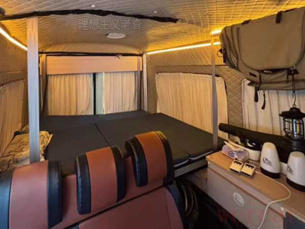 后排座椅左边是一张靠窗侧柜,可打造成车内微厨,方便旅途做饭;座椅后面是一张固定式横向双人床,床铺非常平整,解决了自驾游休息问题。