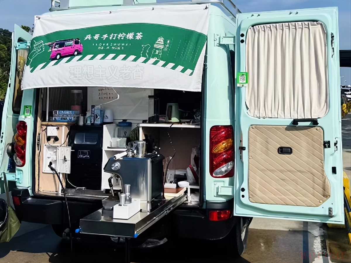 "改装移动店铺/露营车:" 这是核心创意。通过改装,将一辆静态的车辆变成了一个集多种功能于一体的移动平台: