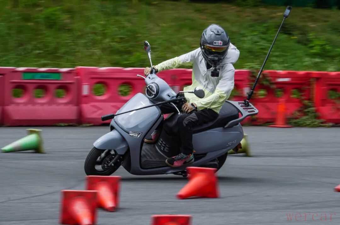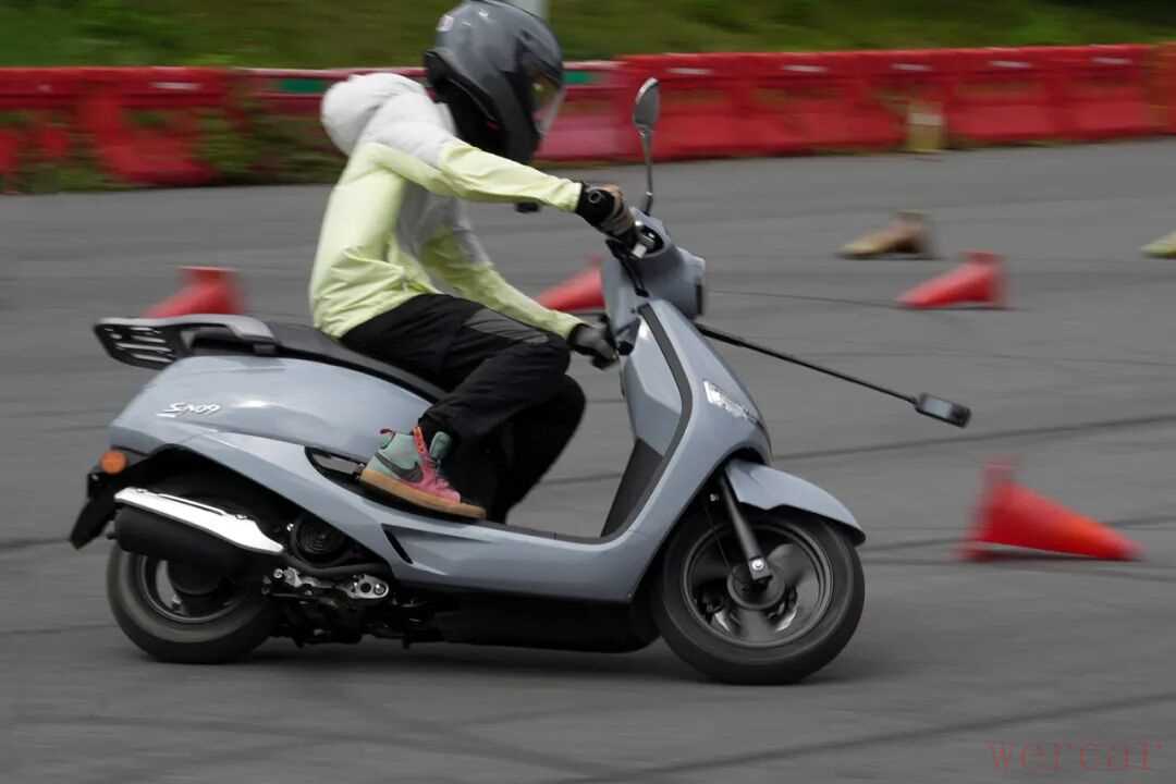 车身配重的大部分设置在以驾驶者乘坐位置为中心的中后部上,小巧而贴近上半身的车把具有轻盈的操控感和较大的舵角设计,即便是力量较柔弱的女生操作起来也不会觉得有压力和难度,车身对方向和重心的操作回馈非常迅速,中低速变线甚至可以用灵动来形容。