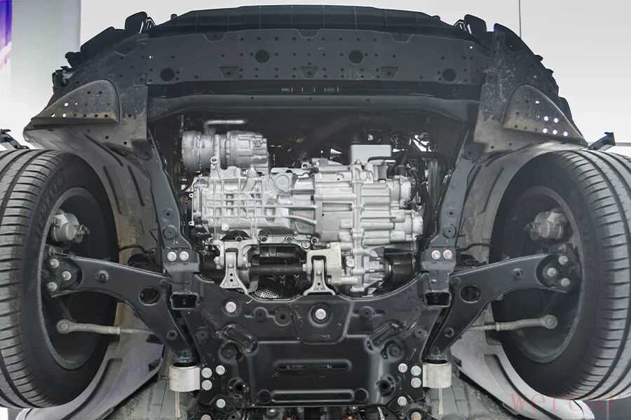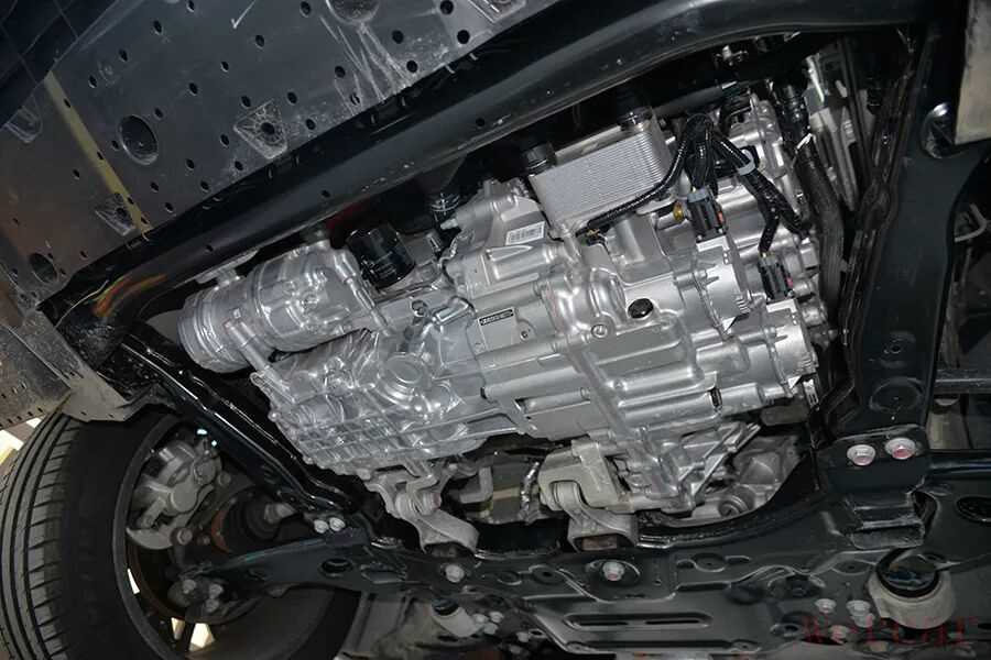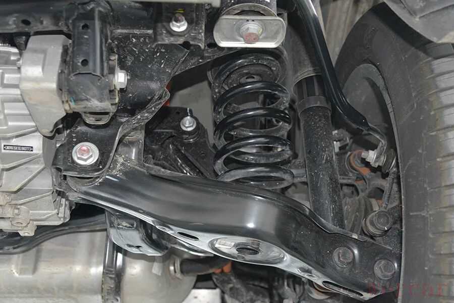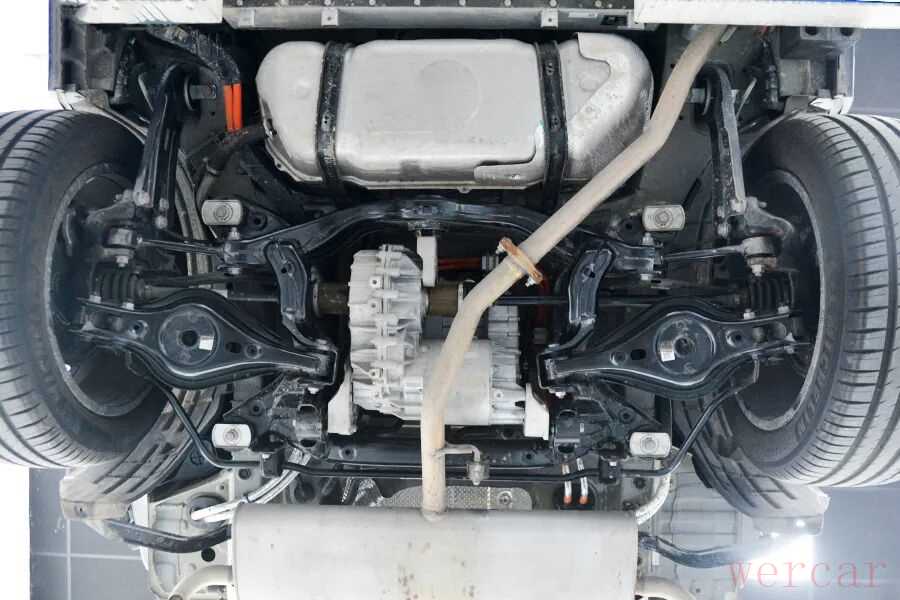前副车架为双层冲压钢板全框结构,发动机和混动变速箱采用不多见的四点悬置,振动会更小一些。