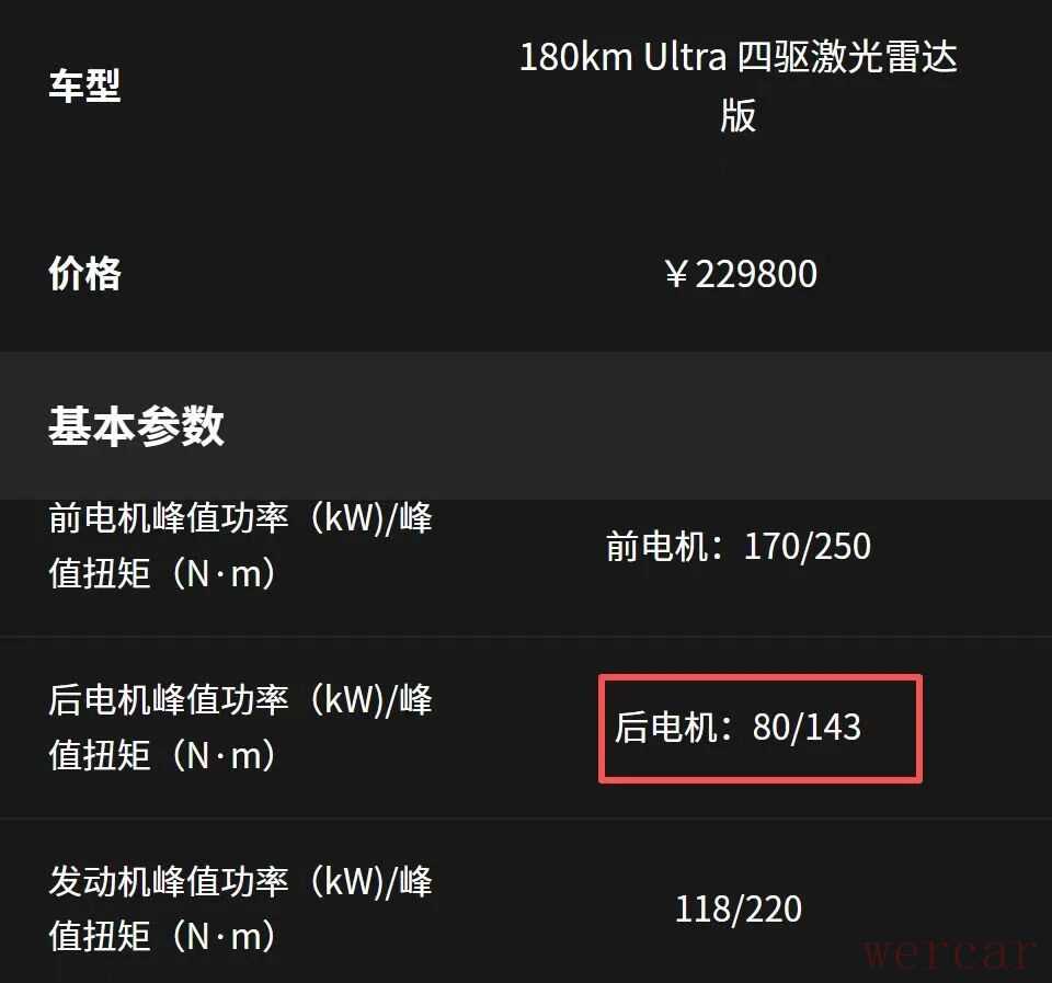 不过,官网显示后电机峰值扭矩只有143牛米,太谦虚了。