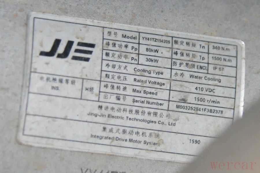 因为是四驱版本,所以还有一台后电机,供应商是精进电机,铭牌上标称工作电压410伏,最大功率80千瓦,额定转矩340牛米,峰值转矩高达1500牛米!