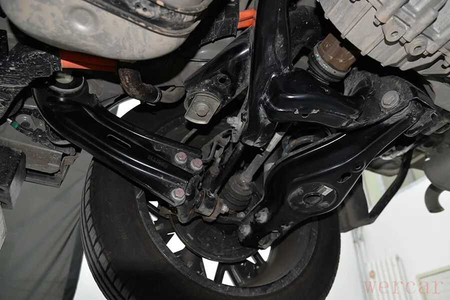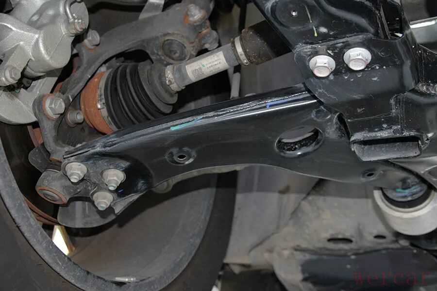 后悬是常见的“三横一纵”的四连杆结构,下摆臂和纵臂都是冲压钢板材质,后轮连接盘也是铸铁材质。