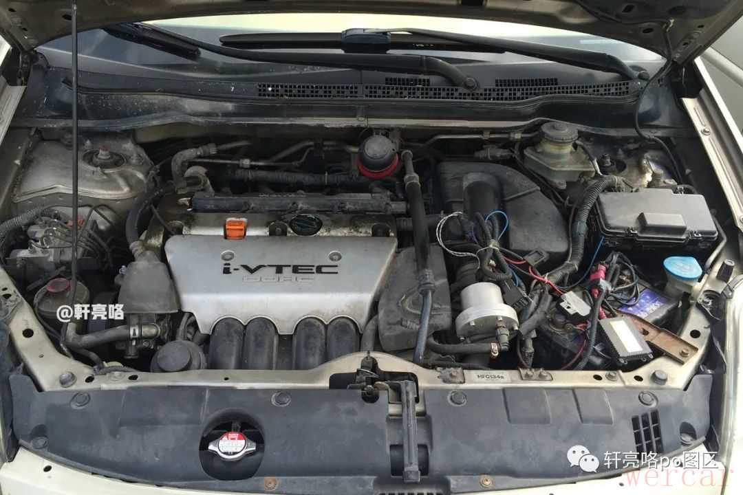 ↑ 本田时韵Stream初代RN3型,机舱视角。可见里头有i-VTEC字样的引擎盖,下端则是K20A型2.0升自吸引擎。