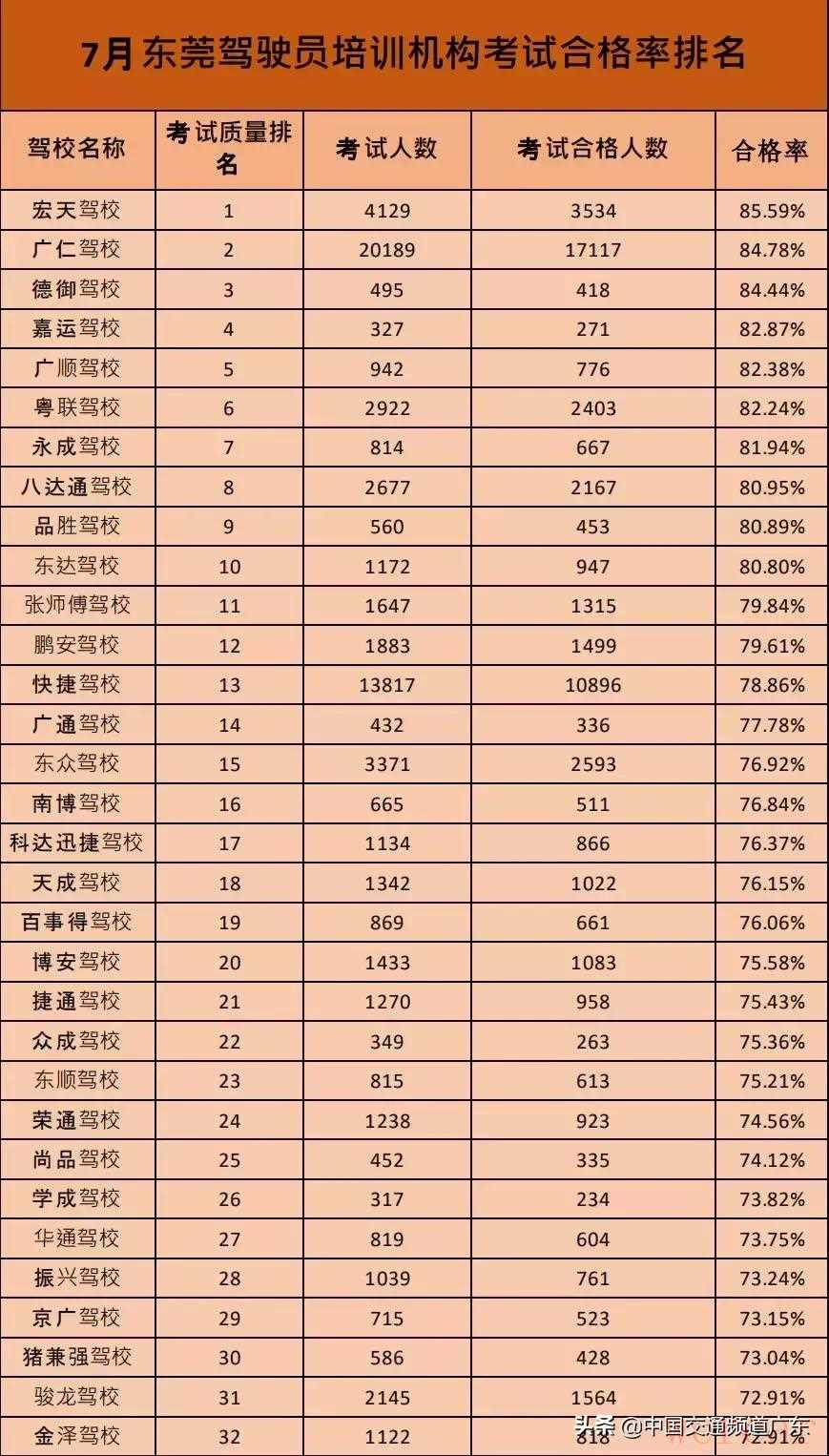 为了提升东莞各驾校的教学质量,给广大考驾照的市民营造一个良好的学习环境,近日,东莞市公安局交警支队向社会公布2019年7月份东莞所有驾驶员培训机构考试质量排名。同时公布东莞市驾驶员考试总体情况。