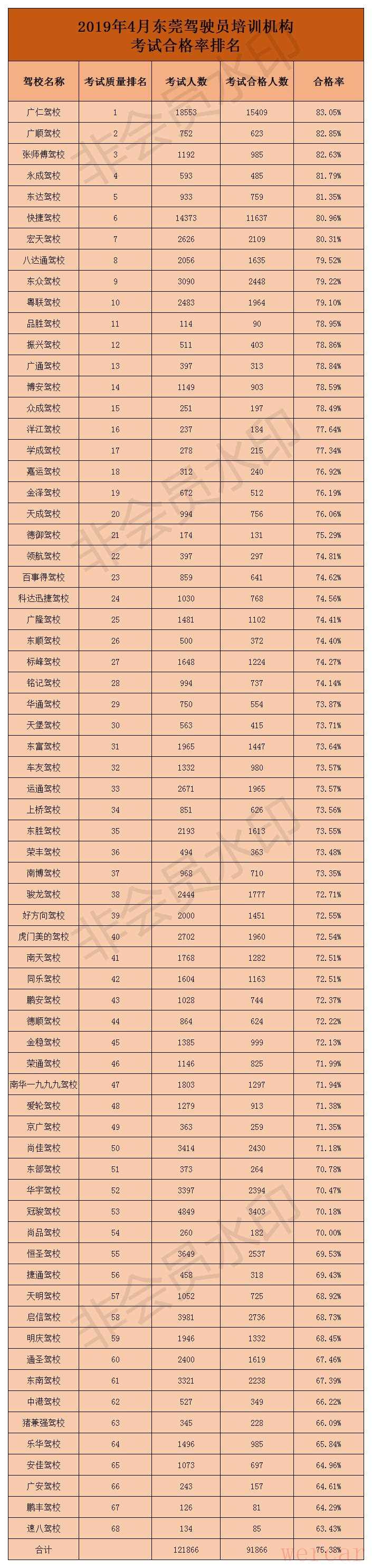 为了提升东莞各驾校的教学质量,给广大考驾照的市民营造一个良好的学习环境,近日,东莞市公安局交警支队向社会公布2019年4月份我市所有驾驶员培训机构考试质量排名。同时公布我市驾驶员考试总体情况。