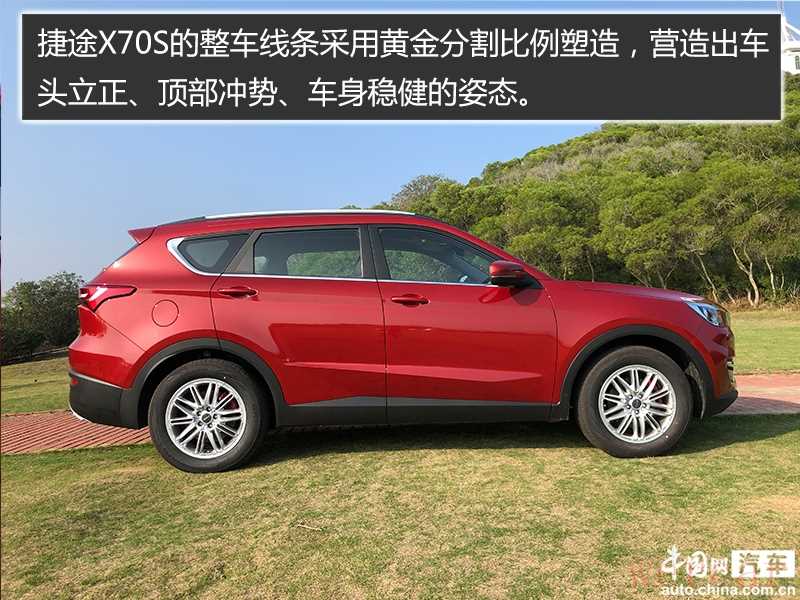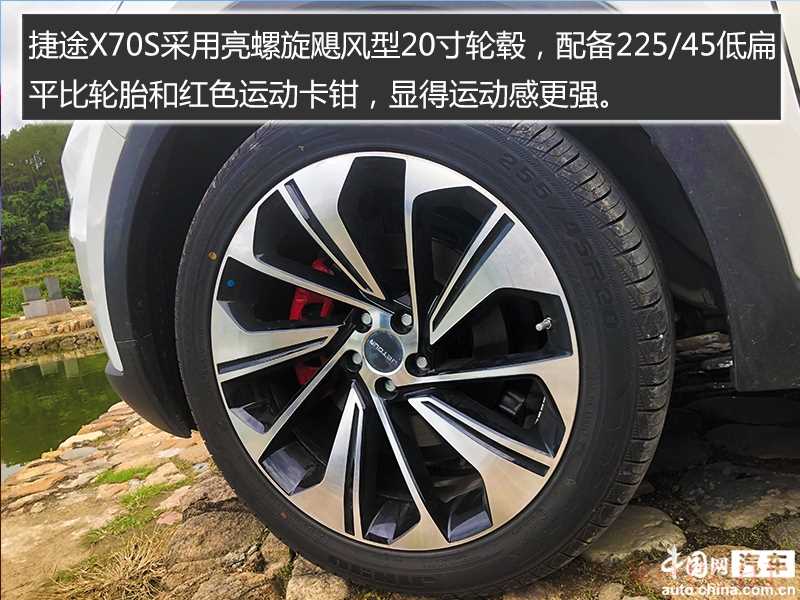 捷途X70S的整车线条采用黄金分割比例塑造,营造出车头立正、顶部冲势、车身稳健的姿态;令人眼前一亮的是,捷途X70S采用亮螺旋飓风型20寸轮毂,配备225/45低扁平比轮胎和红色运动卡钳,显得运动感更强;捷途官方表示,因为采用运动基因调教,这款新车的制动距离只需38米(0-100km/h)。