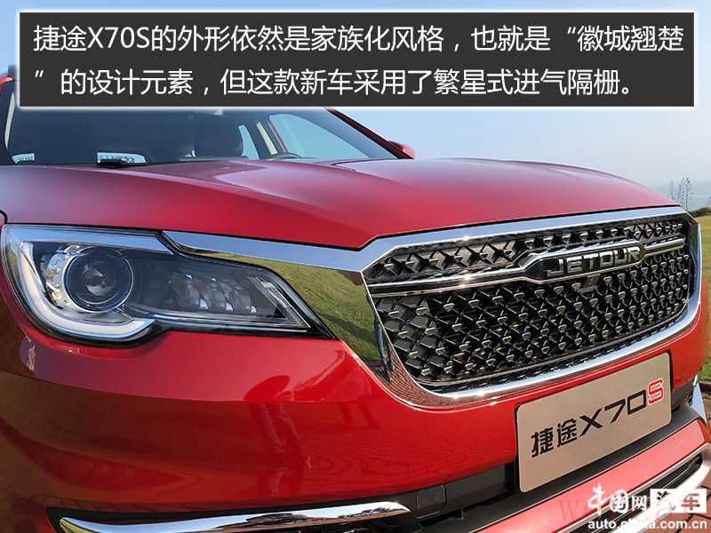 捷途X70S的外形依然是家族化风格,也就是“徽城翘楚”的设计元素,但这款新车采用了繁星式进气隔栅,配合昂首的前脸设计显得张弛有度。前大灯设计源自于中式窗户的几何造型,含蓄却也不失光芒。