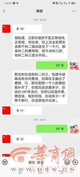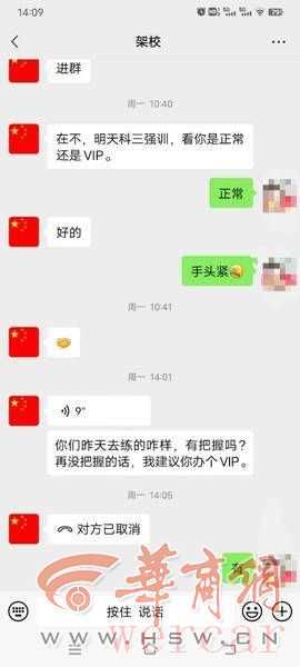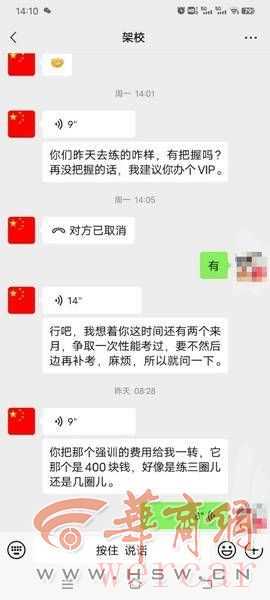 在李先生提供的与庆华驾校倪姓负责人的微信对话中,华商报记者看到,5月27日,李先生给倪姓负责人转去1600元。6月6日,倪姓负责人联系李先生,“在不,明天科三强训,看你是正常还是VIP”,李先生说正常,手头紧。负责人问练车情况咋样,考试是否有把握,没把握建议办VIP,“我想着你这时间还有两个来月,争取一次性能考过,要不然后边再补考麻烦。”