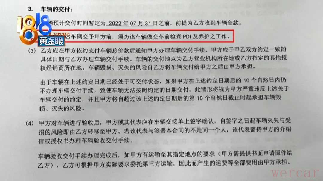 朱经理表示,因为传感器有问题,无法立即维修。购车合同显示,4S店在交付前,须为该车辆做交车前检查PDI及养护工作。PDI是指售前检测证明,方先生希望看PDI报告,朱经理提供了两页纸,一张上写着车型、车架号、技师签名、检查日期,另一张上写着检查项目,前面都打了勾。