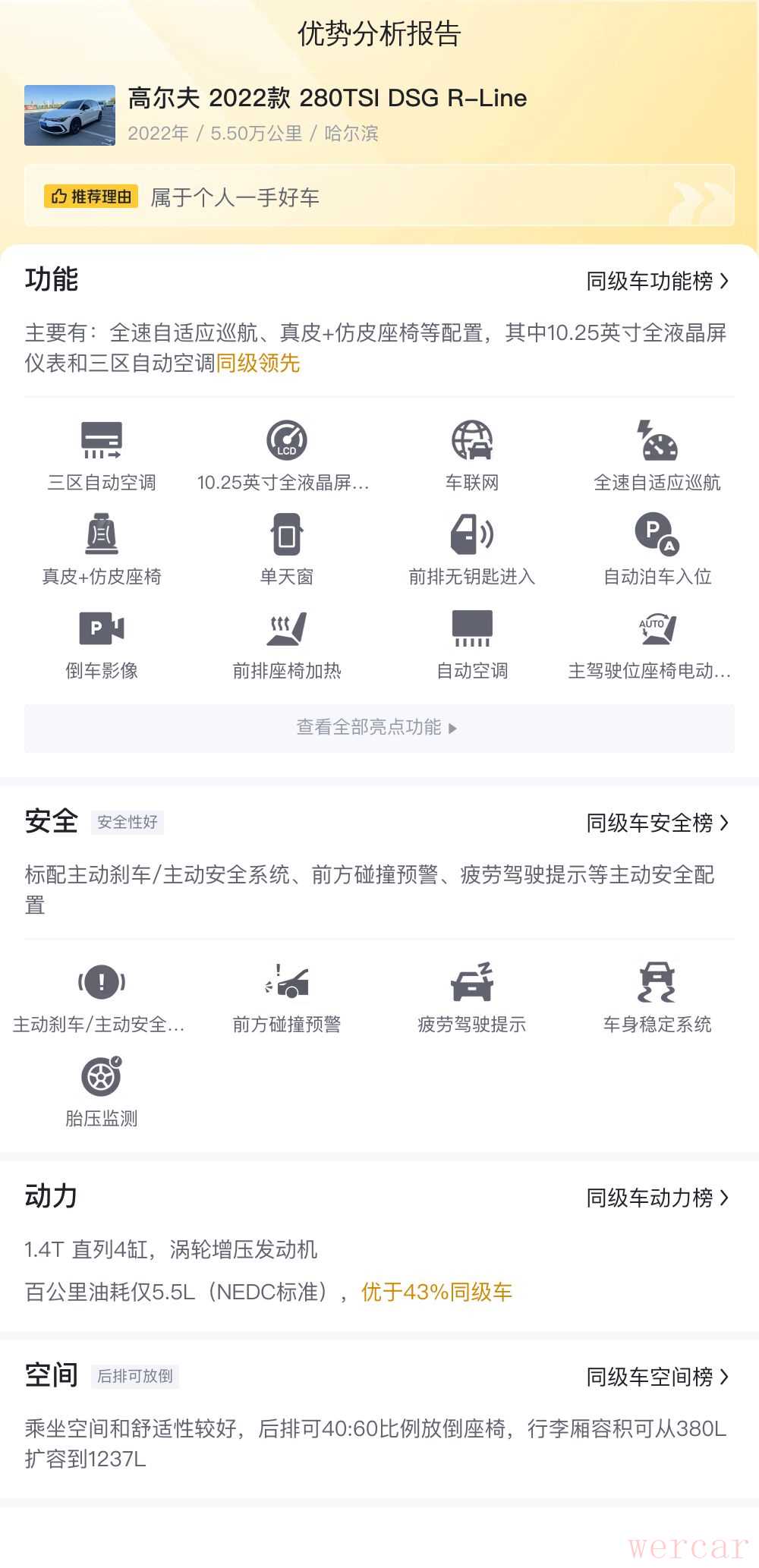 综上所述,高尔夫 2022款 280TSI DSG R-Line作为一款集时尚、科技与实用于一体的紧凑型轿车,在市场上展现了其独特的魅力。它在动力性能、油耗经济性、驾驶辅助技术以及内饰设计等方面均表现出色,特别适合追求高品质生活且注重节能环保的城市家庭使用。然而,与其他同级别车型相比,它也存在一些不足,如后排空间较小、内饰材质需勤加打理以及配置提升空间等。尽管如此,这款车依然凭借其诸多优点而备受消费者青睐。如果您正在寻找一款性价比高、性能卓越且设计精致的紧凑型轿车,那么高尔夫 2022款 280TSI DSG R-Line绝对是一个值得考虑的选择。