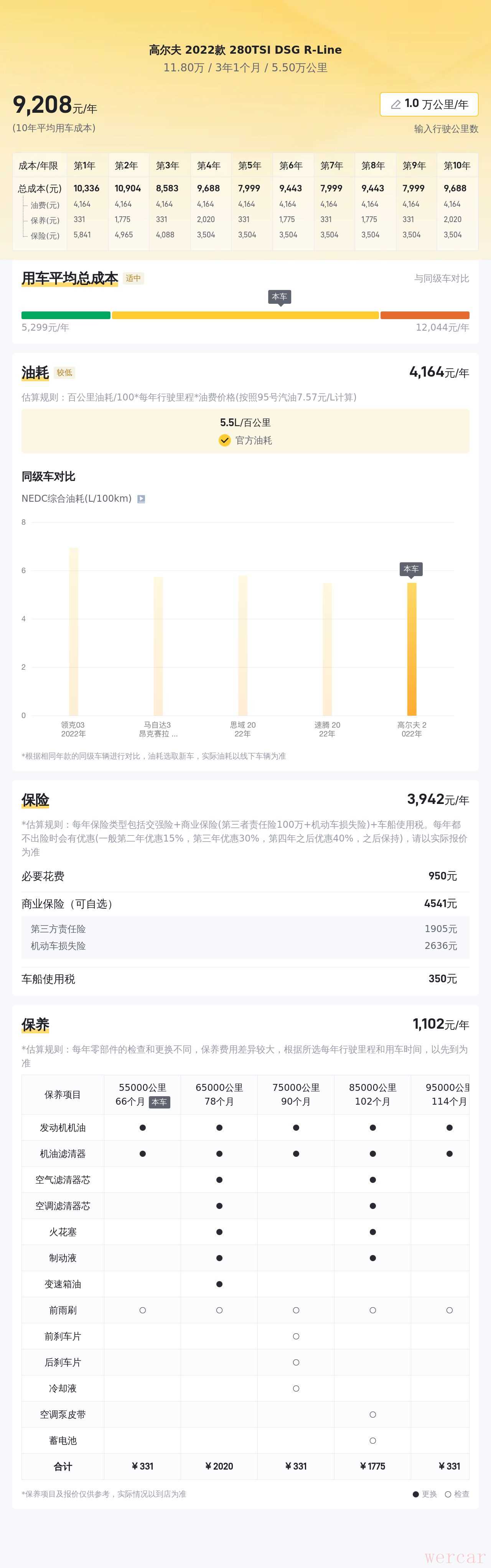 在用车成本方面,该车官方公布的百公里油耗为5.5升,按每年行驶一万公里里程计算,燃油费用约为4687元,年度商业保险约3828元,每年保养费用约1046元,平均年度用车总成本约9561元,与同级别车型相比,用车成本适中,经济性较好,是一款适合家庭代步和长途出行的实用车型。