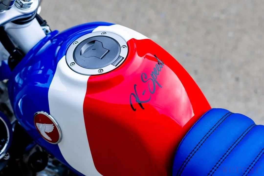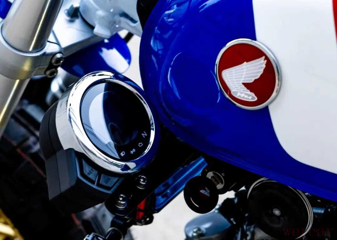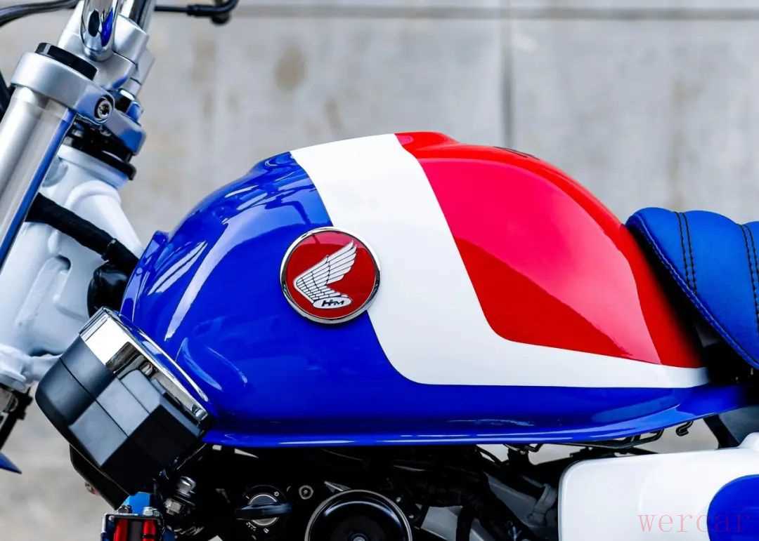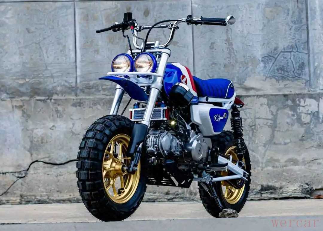 DIO Baja XR此次K-SPEED的Monkey Baja 125”,除了外观上的优化,也对各处细节进行了重新设计,整车采用了本田的蓝白红三色,标志性的双眼大灯加入了蓝色边框,还将仪表安装到侧面,还有前后高位挡泥板。