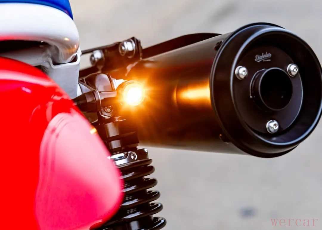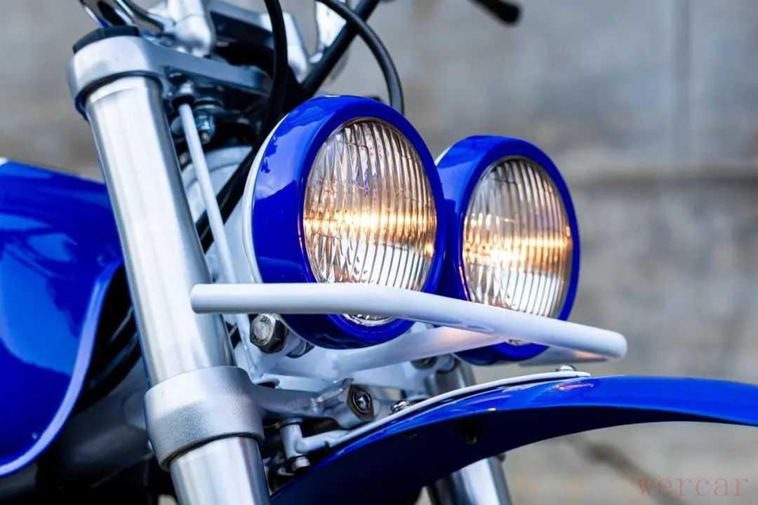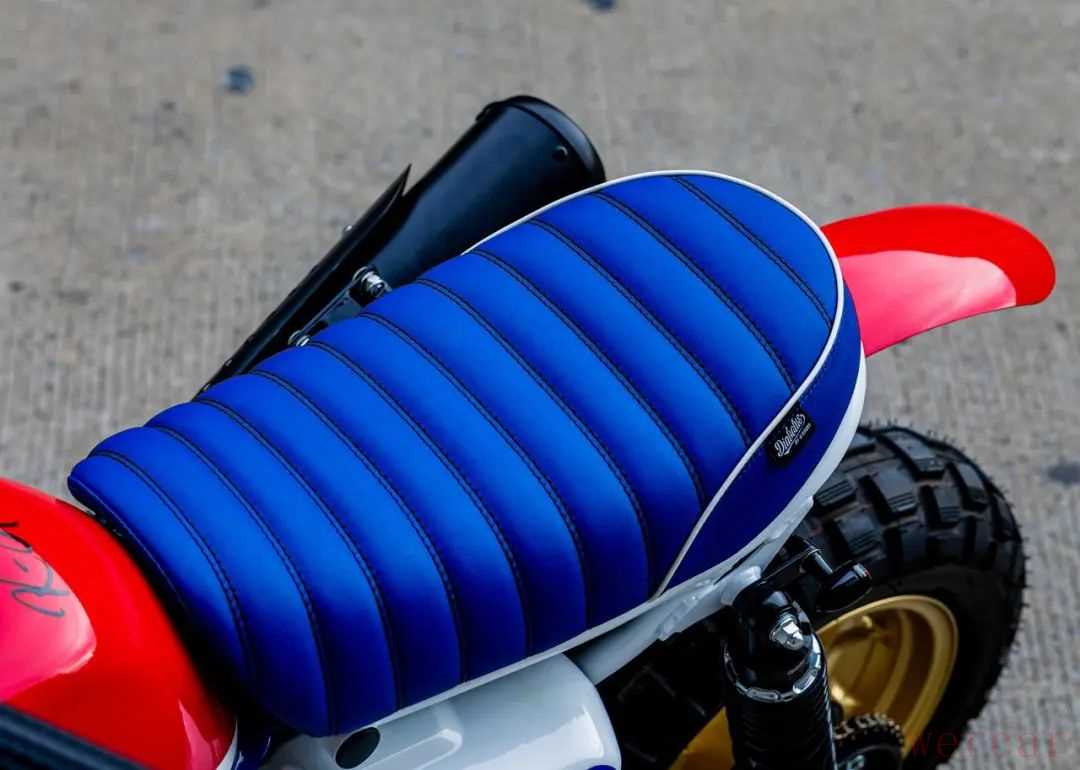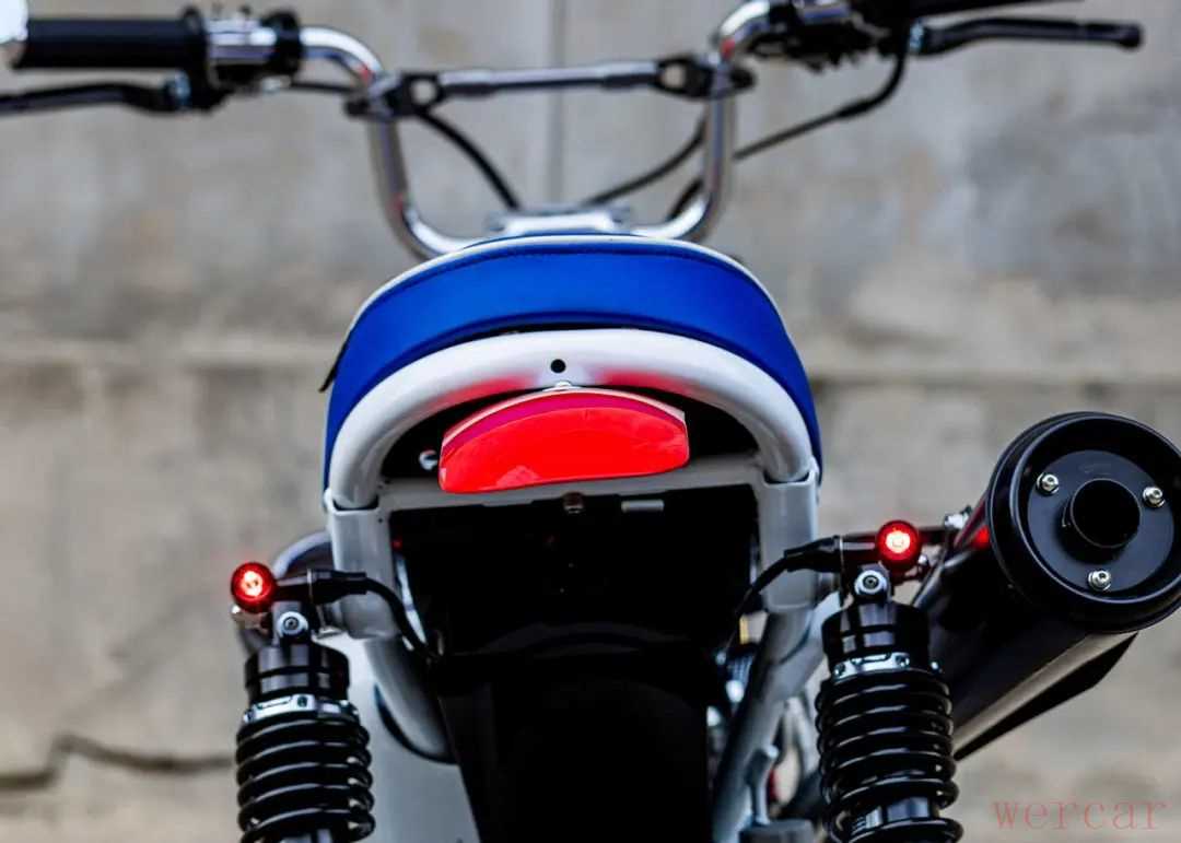 此外手把加入了牛角后视镜还有蓝色毛毛虫座垫、迷你转向灯,轮毂也喷为金色,新增发动机护板,减震也更换为强化版本,另外采用了攀爬风格的Diabolus排气。