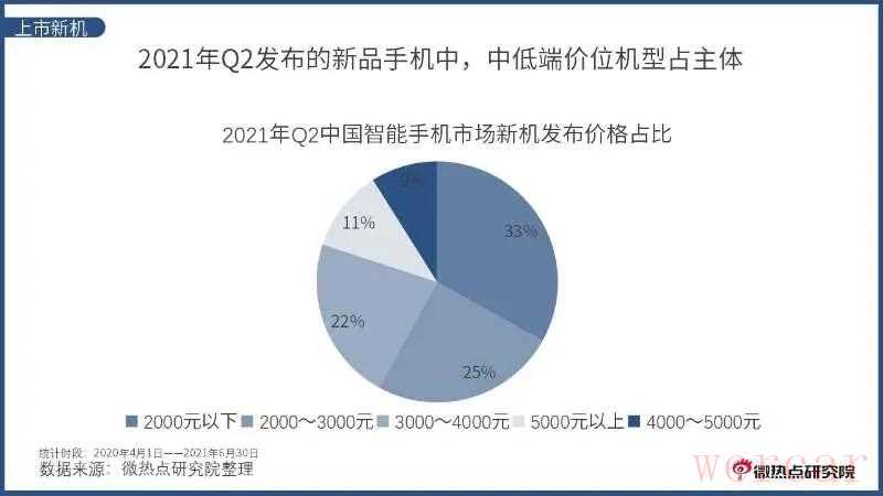 从今年Q2开始,千元机型的新品在各品牌中的占比开始上升,《2021年Q2中国智能手机行业网络关注度分析报告》显示,2000元以下机型数量较多,占比均约33%;其次为2000元—3000元机型,占比约为25%,3000元—4000元机型占比约22%。