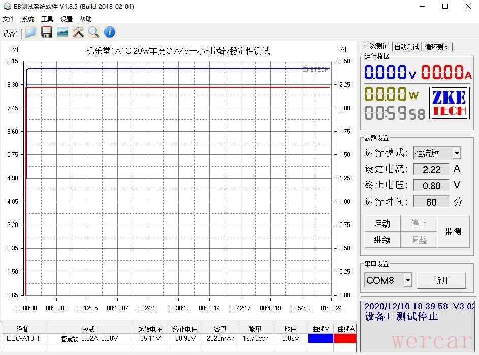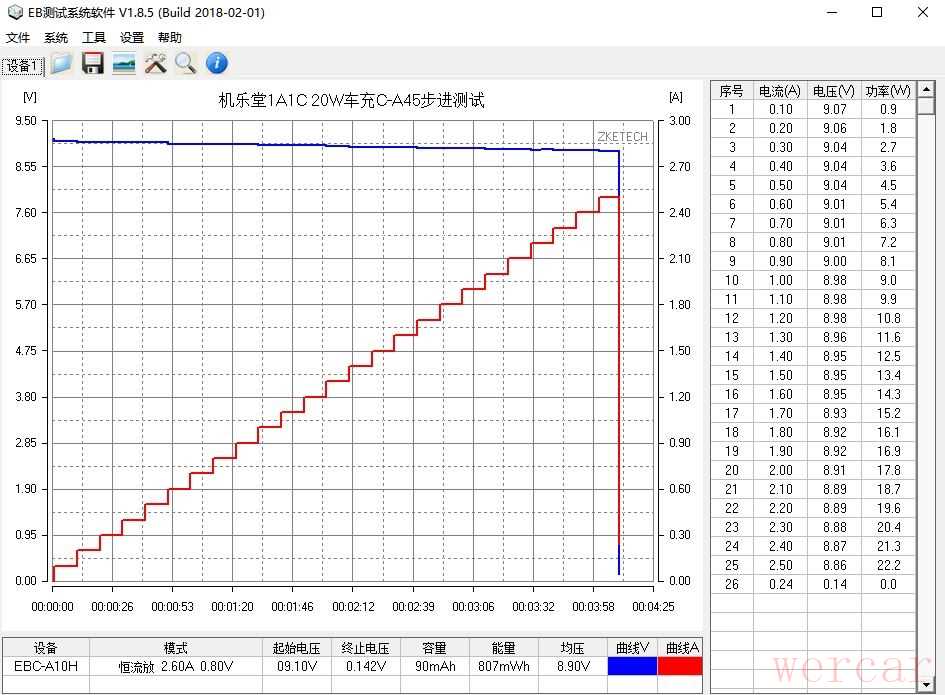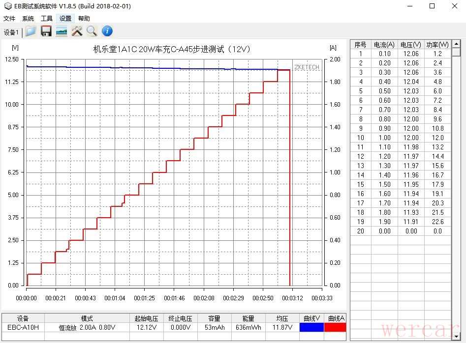 使用EB程控电子负载测试机乐堂1A1C 20W车充的最大输出功率,以0.1A为电流步进幅度,10秒为时间间隔,最终录得车充在9V档位的最大输出为8.86V 2.50A 22.2W。