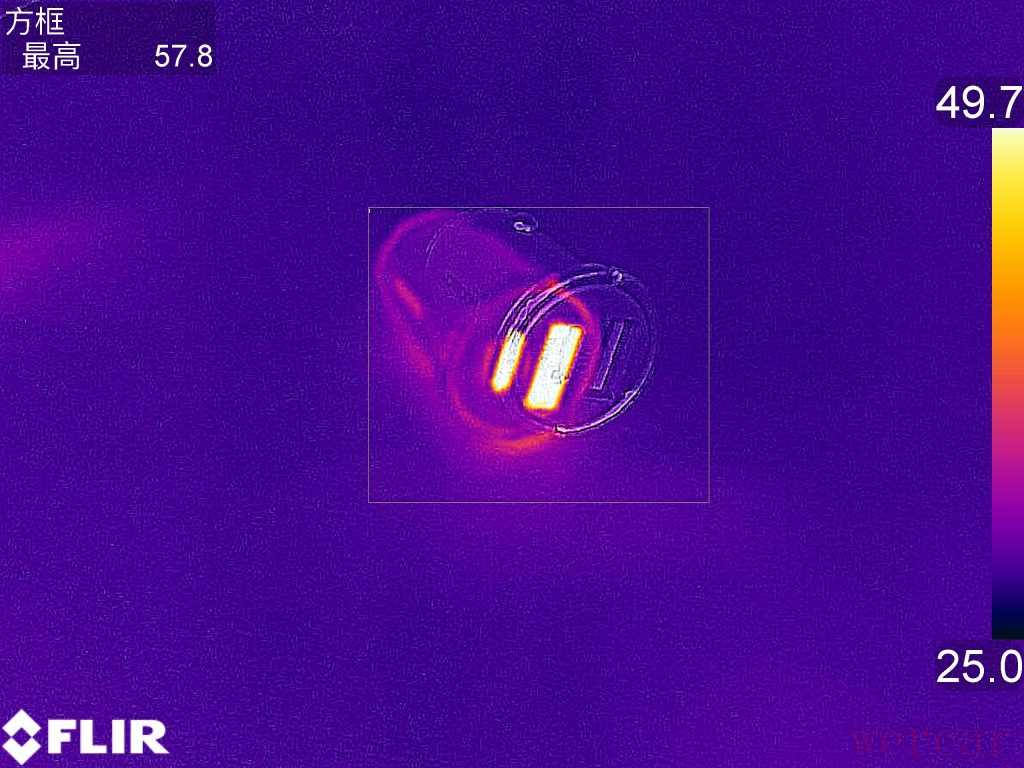 迅速拔出车充进行温度测试,当前最高温度为57.8℃,主要集中在车充内部接口处,温升约为29.1℃。