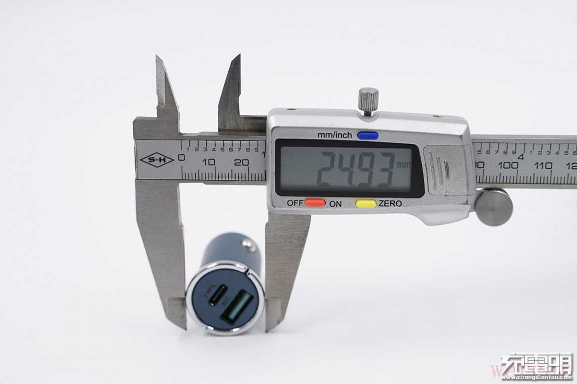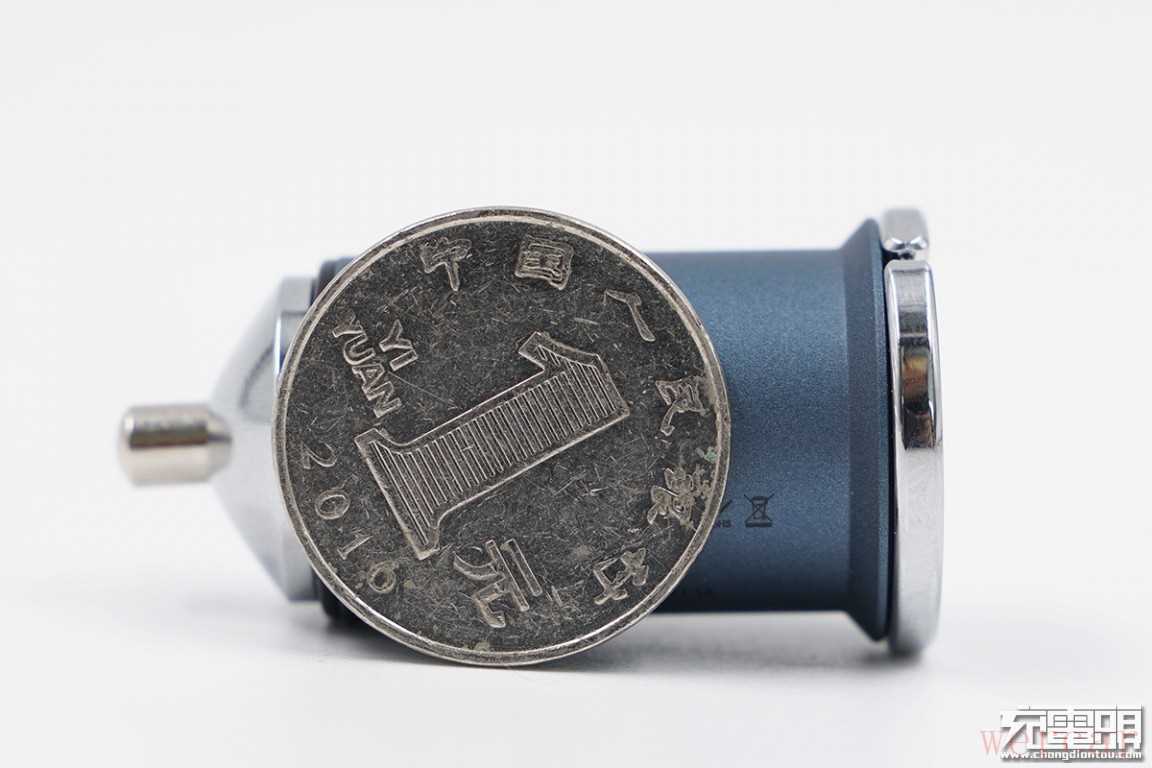 使用硬币对比,可以看到硬币直径比车充宽度稍大。下面进行实际测量。