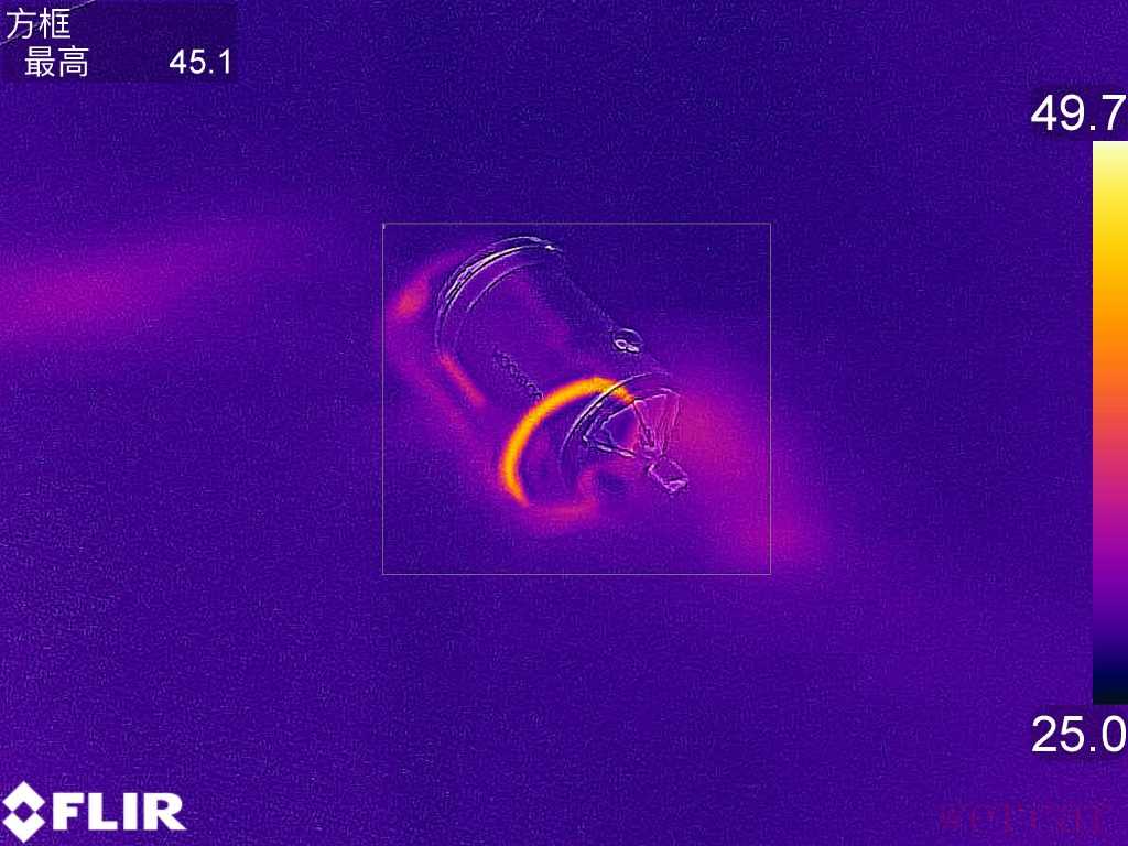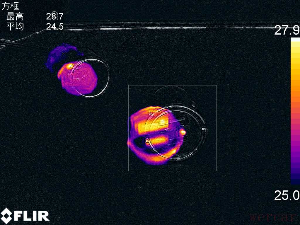 对车充的温升进行测试,测试条件为在温度约为25℃的恒温箱内以9V 2.22A 20W的功率持续输出一小时进行测试。准备开始测试前,最高温度为28.7℃。