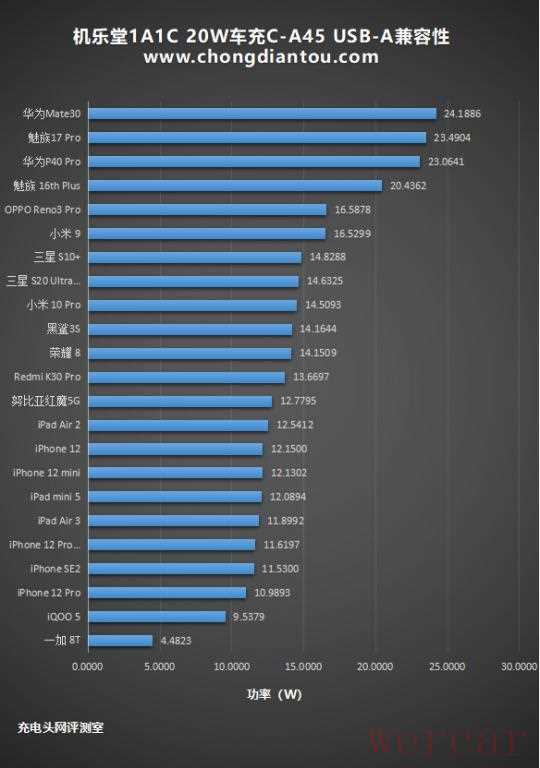 华为的两款旗舰分别排名第一和第三,第二与第四则是魅族的两款旗舰机;一加 8T功率为4.48W,排在最后。可以说这款车充的A口特别适合华为手机和魅族手机使用。三、充电“铁人四项”1、全程充电实测