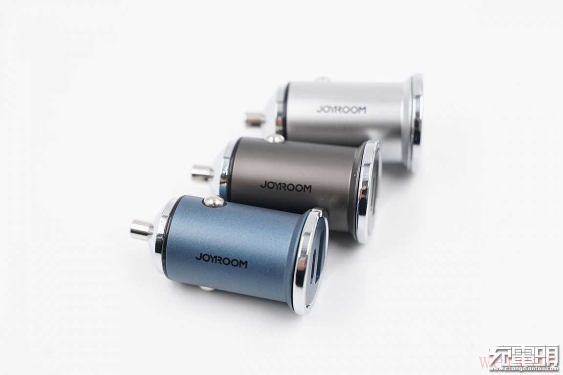 JOYROOM 1A1C 20W车充共推出三种颜色,按照翻译分别是蓝色、锖色、银色。三者手感也不相同,其中蓝色有些磨砂质感。可以看到车充侧面,一面印有“JOYROOM”标志,黑色字体。另一面则是参数介绍,与包装一致,不再赘述。