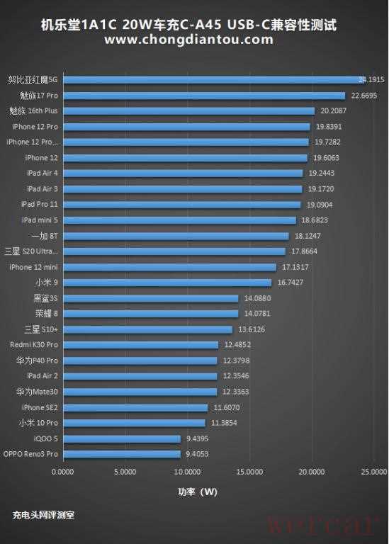 为了让大家更方便查阅,我们将车充USB-C接口充电兼容性的测试数据放在表格当中。可以看到大部分设备都符合预期,iPhone 12系列除了mini功率都接近20W;iPad的表现也不错,除了老款的iPad Air 2,功率也都接近20W 。安卓机型中努比亚红魔5G一骑绝尘,超过24W,应是得益于车充22W的PPS;魅族 17 Pro表现也不错功率达到22.66W。