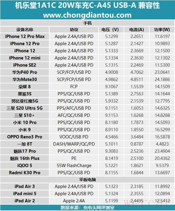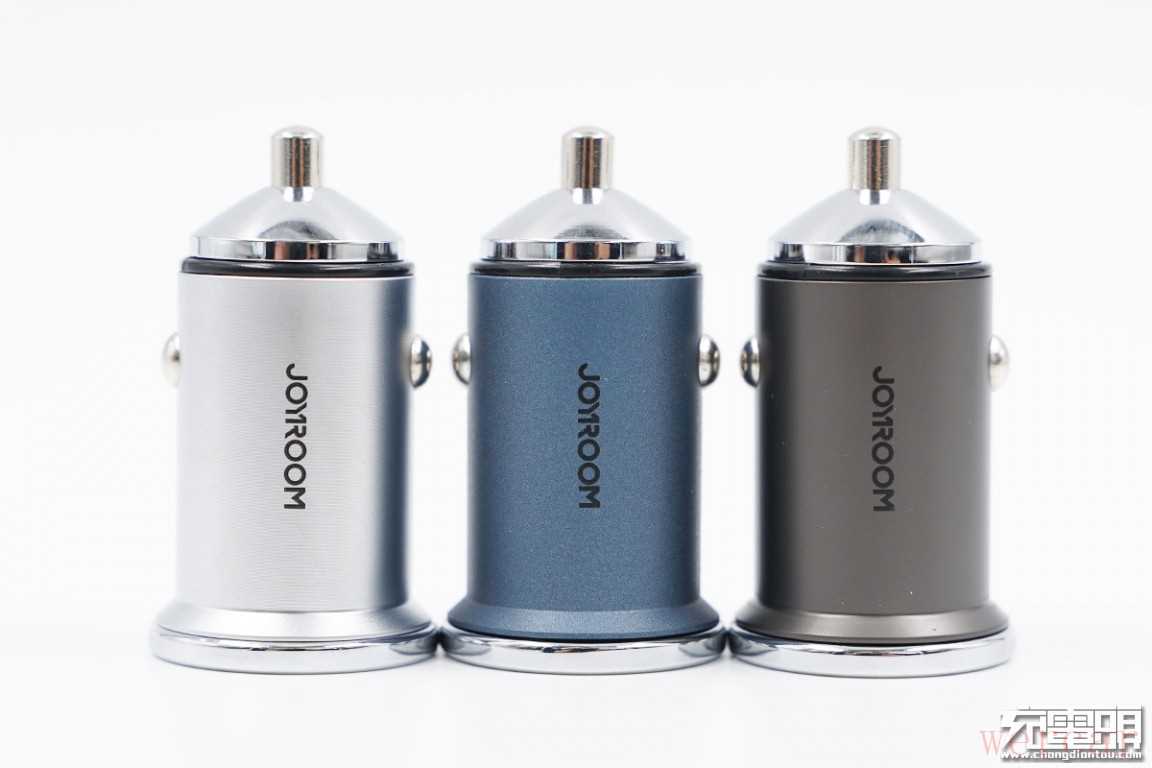 再迅速将车充翻面,当前最高温度为45.1℃,主要集中在车充内部,温升约为16.4℃。温升测试小结一小时满载温升环节是用来测试充电器在极限使用的情况下的发热情况,用户日常使用中很少会遇到这种长时间满载的情况。手机、平板、充电宝等数码设备功率不大,温升会较为缓和,而笔记本充电则会随着电量逐渐饱和而降低功率,发热也会同步降低。目前国家标准中对充电器表面温度要求是,不高于95度,JOYROOM 1A1C 20W车充测试最高温度符合标准。充电头网总结机乐堂是专注于苹果配件领域多年的创新性企业,最近推出的JOYROOM 1A1C 20W车充,可以说专为iPhone 12打造。外观上这款车充共拥有蓝色、锖色、银色三种颜色,采用锌合金材质,整体颜值不低,结实耐用。性能上,这款车充拥有1A1C两个接口。USB-C支持Apple 2.4A、Samsung 5V⎓2A、DCP协议,以及QC2.0/3.0、QC4.0+、AFC、FCP、PE2.0、PD3.0和PPS快充协议,具备5V⎓3A、9V⎓2.22A、12V⎓1.67A三组固定电压档位,以及3.3-11V⎓2A一组PPS电压档位。USB-A口支持Apple 2.4A、Samsung 5V⎓2A、DCP协议,以及QC2.0/3.0、QC4.0+、AFC、FCP、SCP、VOOC/DASH/WARP以及PE2.0这些快充协议。在测试中,车充的兼容性确实如表所示,对iPhone 12系列特别友好,安卓机型中华为、魅族、红魔等旗舰机型使用体验也不错。在iPhone 12全程充电测试中,这款车充的充电效果与苹果 20W PD充电器基本一样,确实不错。再聊聊使用场景。移动互联网业已成熟,移动电动汽车的浪潮已经来临,越来越多的电子设备需要充电,车内充电绝对是最重要的充电场景之一。JOYROOM 1A1C 20W车充的1A1C两个接口以及覆盖性极强的快充协议,基本可以满足车充充电场景。总而言之,这是一款颜值较高、体积娇小,性能强大,使用场景丰富的车充,如果有需要的话,可以列入待购清单。
