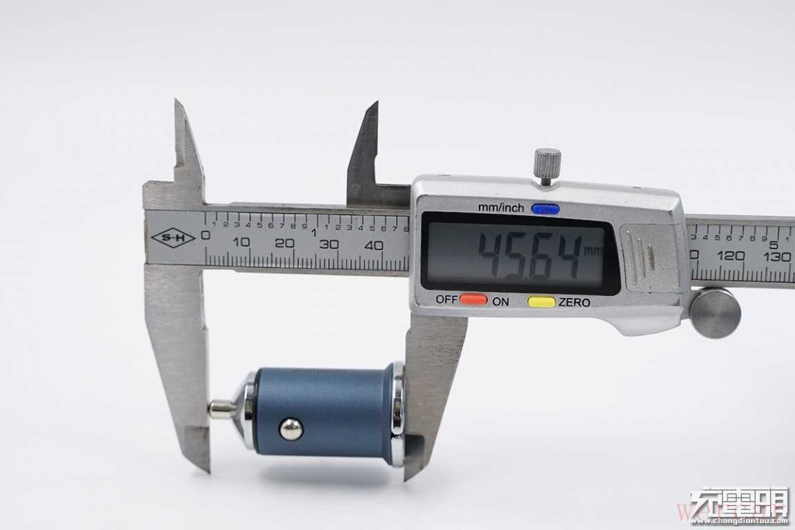 使用游标卡尺测量这款车充的长度为45.64mm,