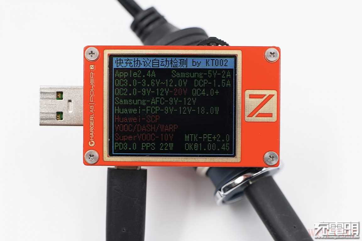 使用ChargerLAB POWER-Z KT002检测车充USB-A口输出协议,显示支持Apple 2.4A、Samsung 5V⎓2A、DCP协议,以及QC2.0/3.0、QC4.0+、AFC、FCP、SCP、VOOC/DASH/WARP以及PE2.0这些快充协议。