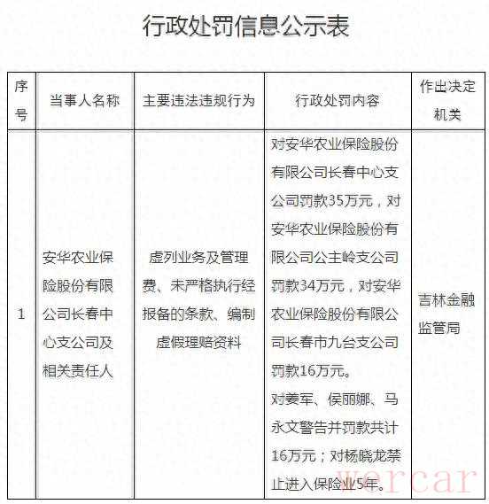 具体处罚包括:对安华农业保险股份有限公司长春中心支公司罚款35万元,对安华农业保险股份有限公司公主岭支公司罚款34万元,对安华农业保险股份有限公司长春市九台支公司罚款16万元。此外,姜军、侯丽娜、马永文受到警告并罚款共计16万元,而杨晓龙被禁止进入保险业5年。