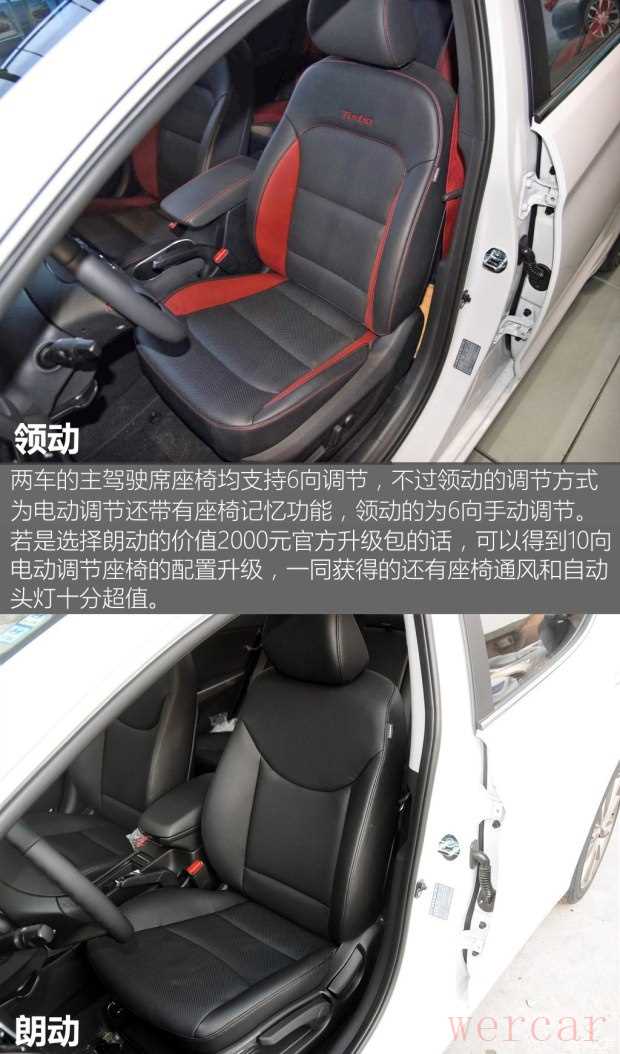 领动的座椅配置比朗动高上不少,支持六向电动调节,还带有座椅和外后视镜记忆功能,舒适性和档次感营造得很足够,而朗动配备的是六向手动调节座椅。面料方面,领动采用凸显运动气息的打孔+拼色工艺的皮质座椅,而朗动采用的则是单色皮质座椅。