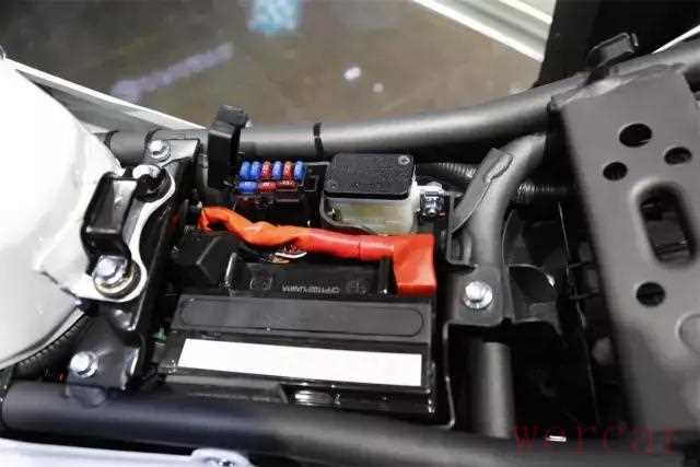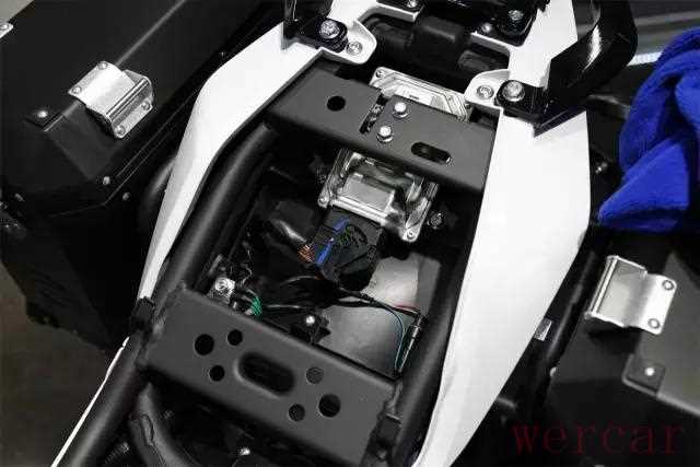打开车座,能发现副车架和650NK有些区别。后制动的油壶在车座底下,这样设置一方面有更好的保护性,同时也有利于后期的维护。电瓶和保险在车座下方,方便更换。值得一提的是厂家考虑到旅行的需求,在车座下增加了手台安装位置,方便通信。