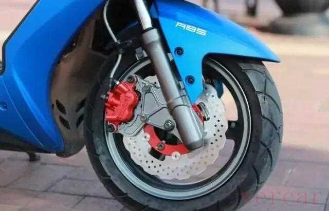当然,最值得一说的还是搭载的博世 9.1ABS系统,要知道,作为一台只有150cc排量的踏板车型,这可是国内第一台搭载 ABS的。所以不得不说,光阳还是非常有勇气,毕竟在很多人看来,这就是杀鸡用牛刀了。小小的刹车盘上红色的配件似乎也是在标示着:这不是一款普通的光阳弯道情人。