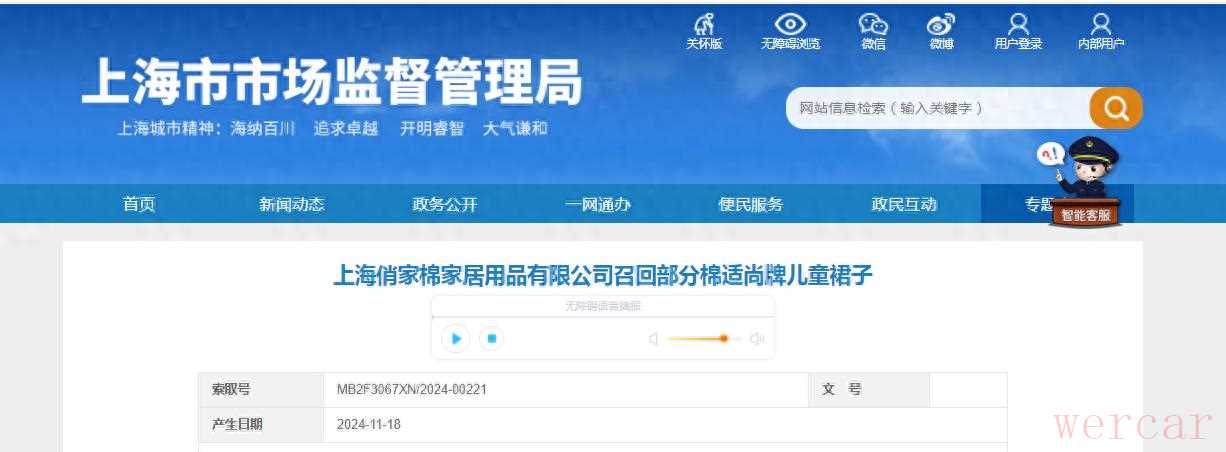 根据中国国家市场监督管理总局(SAMR)发布的官方信息,上海俏家棉家居用品有限公司确实于近期召回了部分“棉适尚”牌儿童裙。