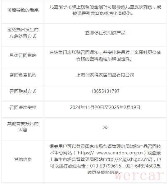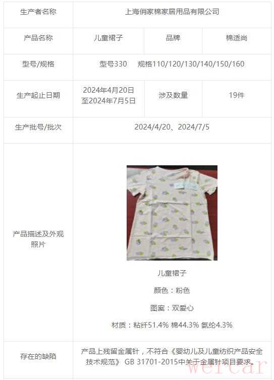 上海俏家棉家居用品有限公司紧急召回,棉适尚牌儿童裙子存在安全隐患