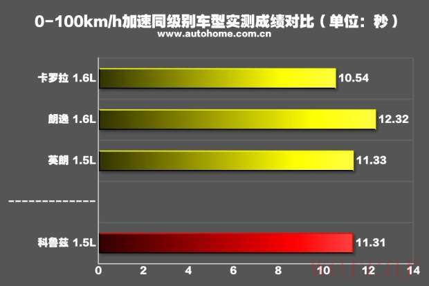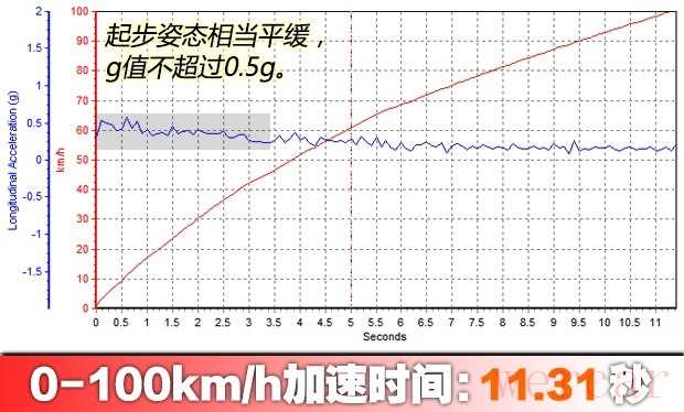 最终11.31秒的结果倒是比官方成绩快了不少,和采用相同动力系统的别克英朗差不多,整个加速过程较为平淡,只有在起步时略微有些推背感。205mm宽度的轮胎正好够用,2000rpm起步时轮胎轻响一下便会立马恢复抓地力。