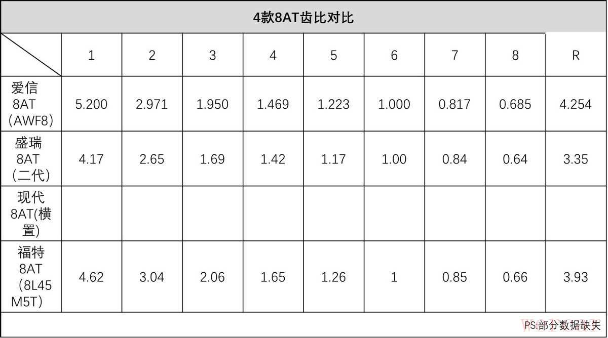 (二代盛瑞8AT)而福特8AT其实是基于通用9AT而来,齿比范围适中,达到了7.0:1,各项性能中规中矩。且各挡位之间的齿比落差基本在1.2-1.5之间,平顺性得以保证。