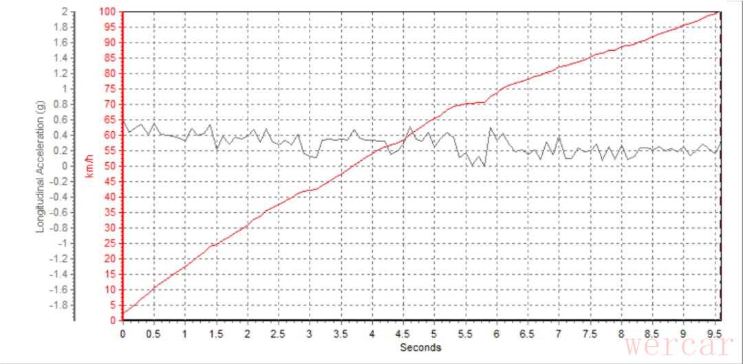 同时我们也进行了百公里加速的测试,实测加速时间是9.57s,这个成绩对于同级对手而言并没有什么优势。说回实际感受,弹射起步转速会维持在2500转左右,一挡时轮胎会伴随着轻微打滑,之后便平稳加速了,在动力这快并不会感觉到爆发力十足。从数据图也可以看出,人在车内感受到的g值也并不大。很明显4008这套1.8T+8AT的动力组合,调校还是偏向平顺性。