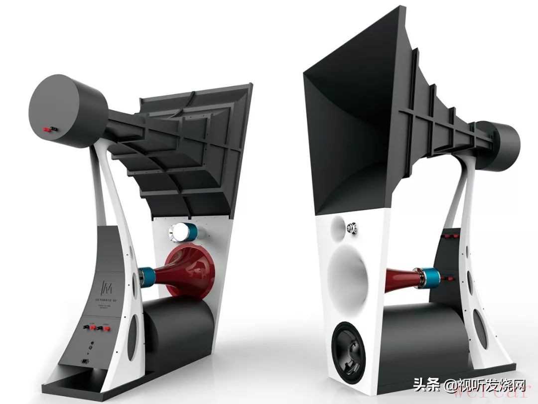 售价数百万元的Magico Ultimate III号角音箱,超厚的铝合金前障板上嵌有三个不同尺寸的圆形号角,号角都是由整块铝合金CNC切削而成,使用了3个23公斤级别的ALE单元--1750DE、4550DE和7550DE,15英寸低音仍然用纸盆单元(内置4000瓦功放),最大的中低号角仅仅是TAD120纸盆而非ALE的126或160驱动头。这对高2.4米,重达360公斤,体积上妥协而没有做五路全号角设计。Magico在Hi-End音响中属最高级别产品,但论在ALE套装里,却只属中端偏低端的组合
