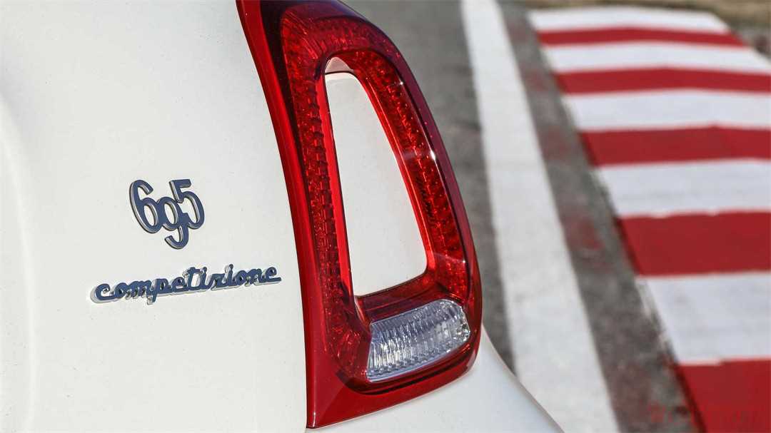 来到车尾,除了尾标换装的是695 Competizione以外,它的排气布局更加的标新立异,采用垂直双边双出的排气口设计,战斗感更为强烈。