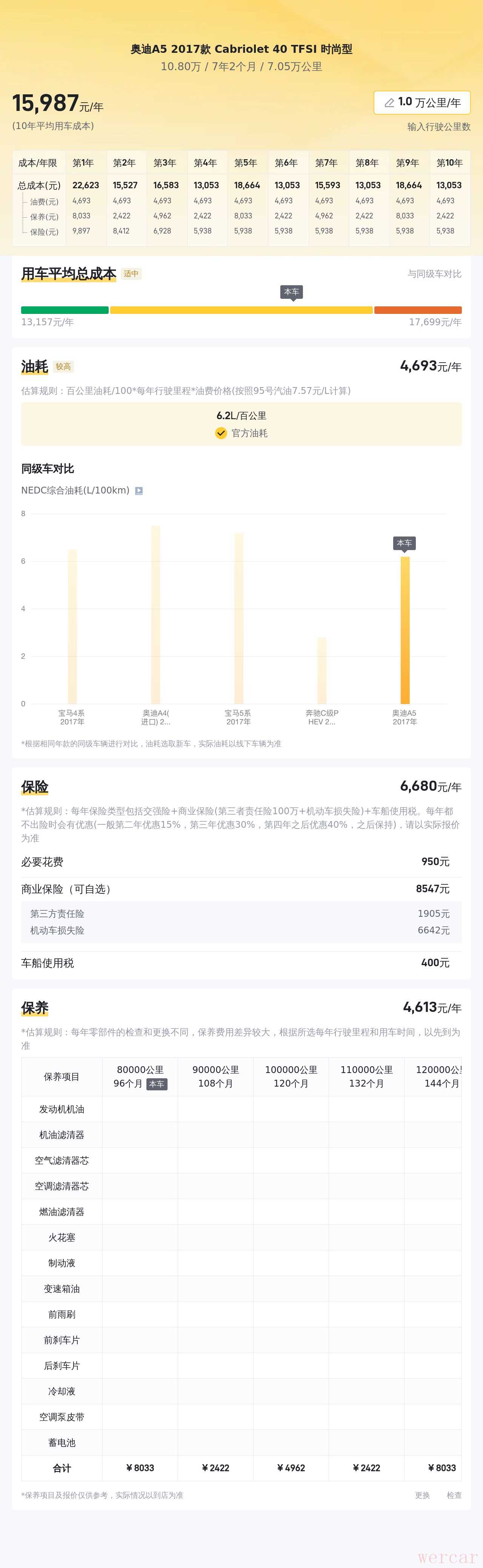 奥迪A5 Cabriolet 40 TFSI 时尚型的行驶成本并不算高。按照每年2万公里的行驶里程计算,油耗成本大约为10512元,保养成本约为3601元,保险成本则约为8062元。总体来看,这款车型的行驶成本在同级别车型中处于较为合理的水平。