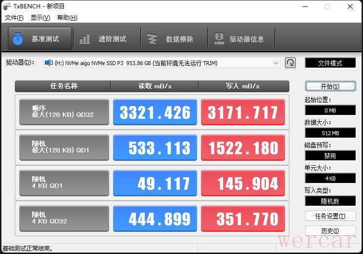 TxBENCH的测试中,aigo固态硬盘P3000表现良好,最大顺序读取高达3321MB/s,最高写入为3171MB/s,其中写入速度能达到3000MB/s以上已经算是很不错的成绩了!