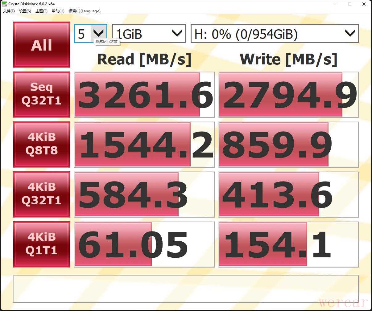 通过CrystalDiskMark的常规测试,本次的aigo固态硬盘P3000的最高顺序读取速度可达3261.6MB/s,写入速度也高达2794.9MB/s,这个成绩相当接近官方宣称的最高3300MB/s,相比我之前的那一款固态硬盘,足足高出1000多!