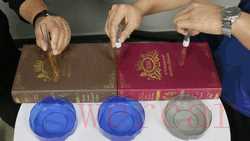 在经过一夜的冷冻之后,我们将这3支装有机油的试管拿出,放在同一水平面上进行侧放,观察它们的流动速度差别