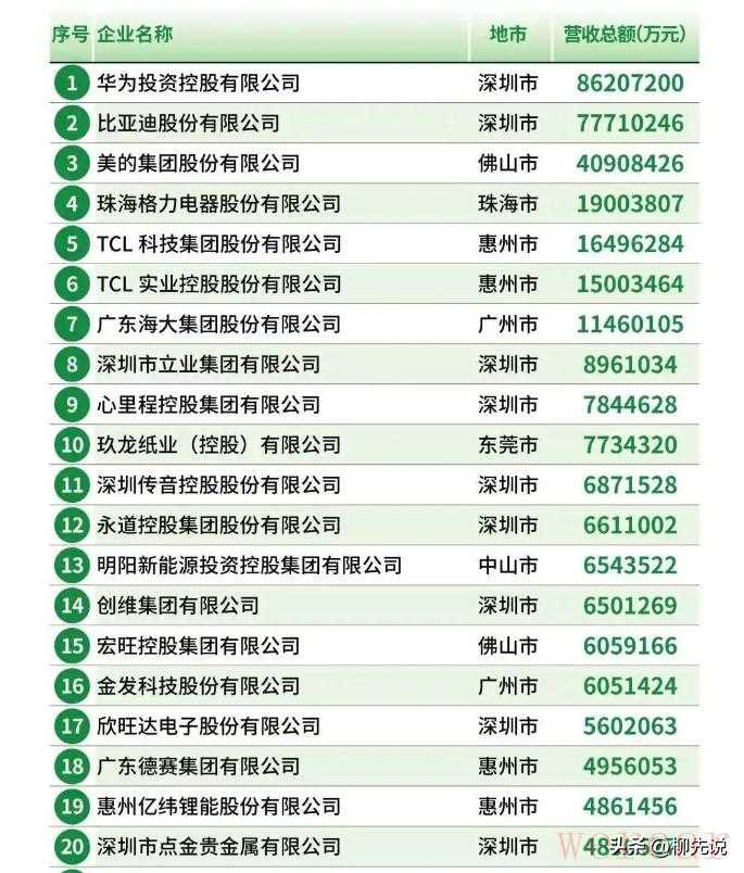 来自惠州的TCL科技集团、TCL实业控股分别位列第5和第6位。TCL已从一家地方电视机厂发展成为横跨电子显示、智能终端、新能源光伏、半导体材料等多个领域;珠海格力电器排名第4,现已发展成为多元化、科技型的全球工业制造集团,产业覆盖家用消费品和工业装备两大领域,空调制造和销售处于全球领先地位。