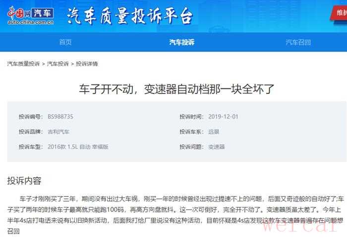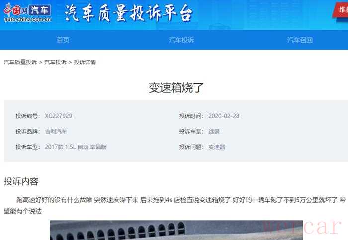 http://315.auto.china.com.cn/)接到了一起关于2018款吉利远景1.5L自动挡车型的故障投诉,该车辆目前处于无法行驶状态。