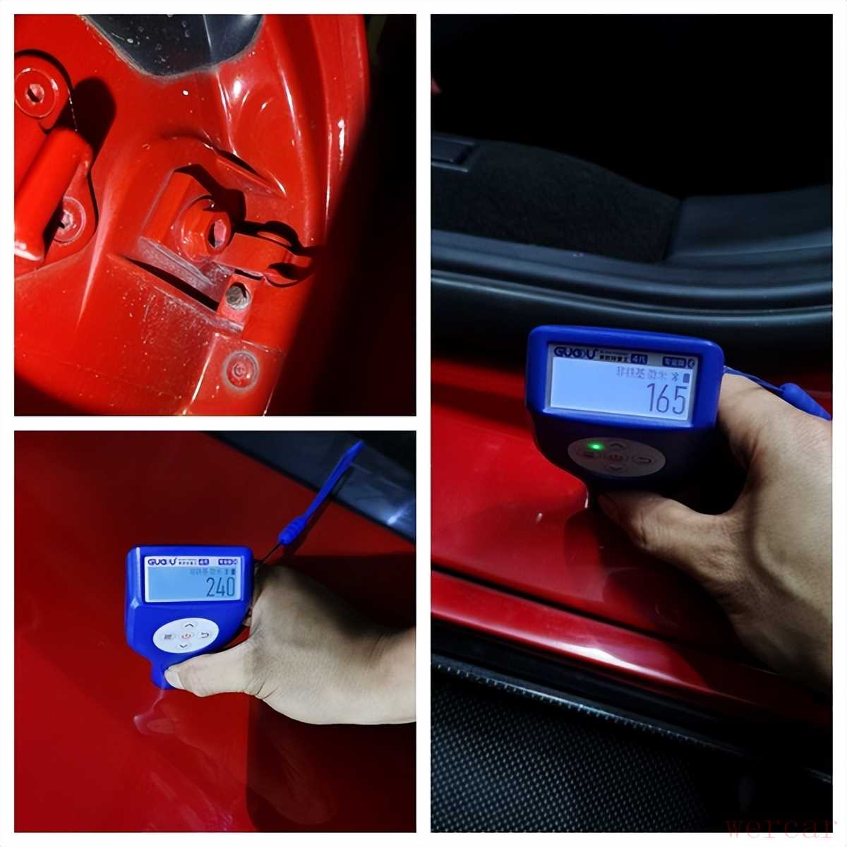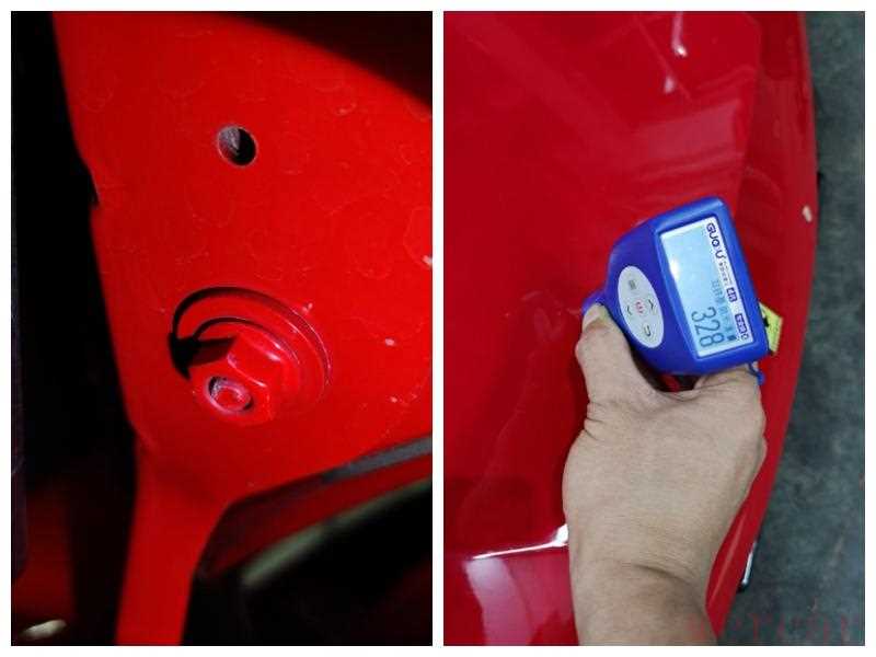 好在车门这些只有喷漆痕迹,检查内部铰链螺丝没有发现拆卸痕迹,漆膜仪测量车门门框结构件,漆面数值也都在正常范围内浮动,肉眼二次检查也没有发现修复痕迹。整个外观检查完毕,主要的事故点就在右前方 ,其它部位只有一些刮蹭修复以及外伤,影响不大。下面来检查发动机的情况。