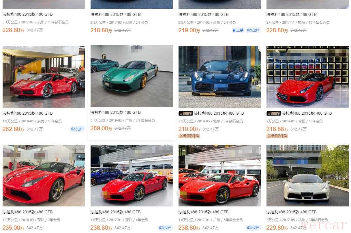 可以看到网上同款法拉利488的车源还是比较多的,就是都比较贵,比今天这辆车贵了二三十万,不过网上的报价肯定还能再谈,估计谈下来也就是200出头的样子。但大家可以看到这些车子的里程数大多都只有一两万、两三万公里,不敢保证全部都是真实的,但肯定有真的,200万都拿出来了,肯定还是要买一辆车况板正一点的法拉利。大家觉得今天这辆车值得考虑吗?