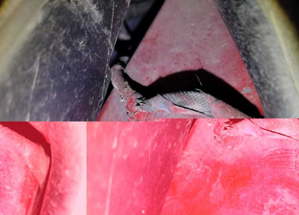 不过右前纵梁问题就比较大了,从灯光阴影处可以明显看到右前纵梁前部有变形凹陷存在,而且右前纵梁上面固定的线束也有重新喷漆的痕迹。既然前纵梁存在变形,那按照国标应该判定为重大事故车,虽然目测损伤得不是很厉害,但是规矩就是规矩。